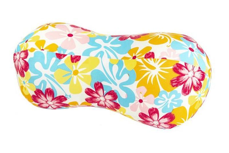 Cojín de playa Fanny Cacahuete Beach con estampado floral tropical en tonos vibrantes de rosa, amarillo y azul sobre fondo blanco. Fabricado en poliéster y algodón, ofrece comodidad y estilo para relajarte en la playa, en el coche o en casa. Su forma ergonómica lo hace ideal para apoyar la espalda o el cuello. Perfecto para amantes del diseño color