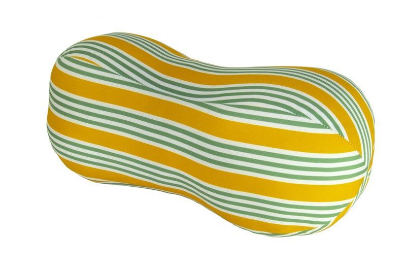 Cojín de playa Gilbert Cacahuete Beach con diseño divertido en forma de cacahuete, ideal para decorar tu espacio al aire libre. Con estampado de rayas verdes y blancas sobre fondo amarillo, este cojín de poliéster y algodón aporta un toque de estilo y comodidad a tu terraza, piscina o jardín. Perfecto para relajarte con estilo.