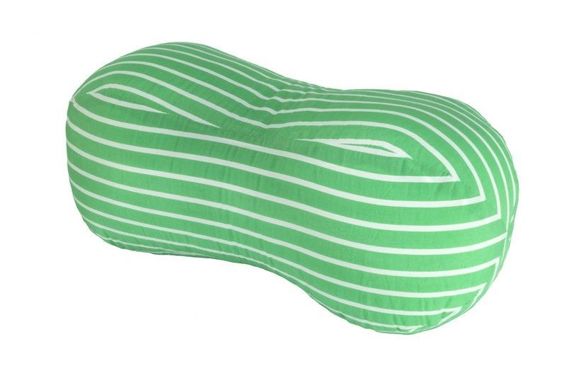 Cojín de playa en forma de cacahuete con rayas verdes y blancas, ideal para relajarte en la playa, piscina o jardín. Fabricado en algodón y poliéster, ofrece comodidad y estilo. Su diseño ergonómico proporciona soporte para la espalda y cuello. Perfecto para días de sol y descanso al aire libre.