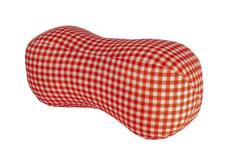 Cojín de playa en forma de cacahuete con estampado vichy en tonos naranja y blanco. Ideal para decorar espacios al aire libre, terrazas o piscinas. Fabricado en tejido resistente de algodón y poliéster, ofrece comodidad y estilo. Perfecto para relajarte con un toque divertido y retro.