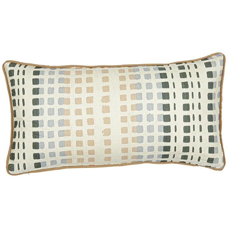 Cojín rectangular de seda y algodón con estampado geométrico en tonos neutros y verde, ideal para decorar sofás, camas o sillones. Con ribete dorado y acabado elegante, aporta un toque sofisticado a cualquier espacio. Medidas: 30 x 60 cm. Perfecto para amantes de la decoración moderna y minimalista.