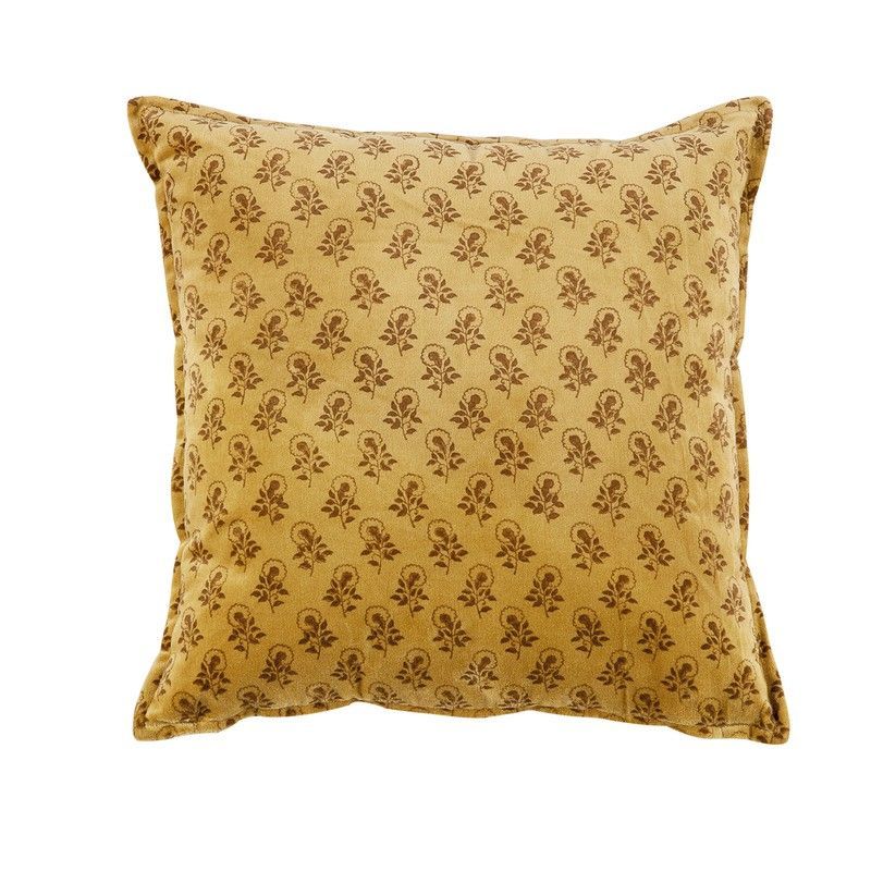 Cojín de terciopelo mostaza con estampado floral en tonos marrones, ideal para decorar sofás, camas o sillones. Su textura suave y diseño elegante aportan calidez y estilo a cualquier espacio. Perfecto para amantes de la decoración clásica y acogedora.