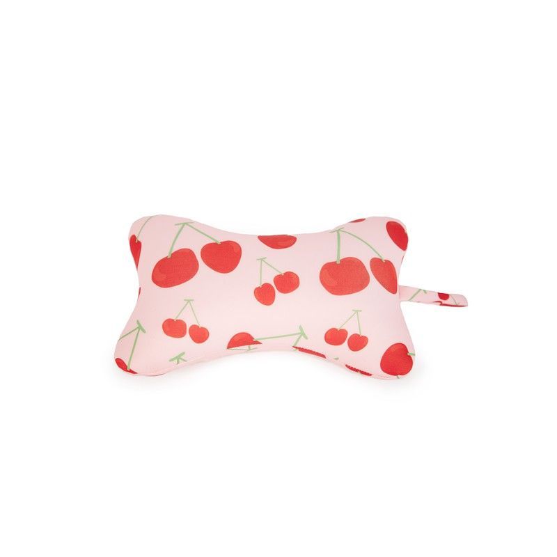 Cojín de playa Ferretti con diseño de cerezas en tonos rosas y rojos, ideal para decorar tu hogar o llevar a la playa. Fabricado en algodón y poliéster, su forma de hueso lo hace cómodo y versátil. Perfecto como regalo para amantes de la decoración divertida y colorida.
