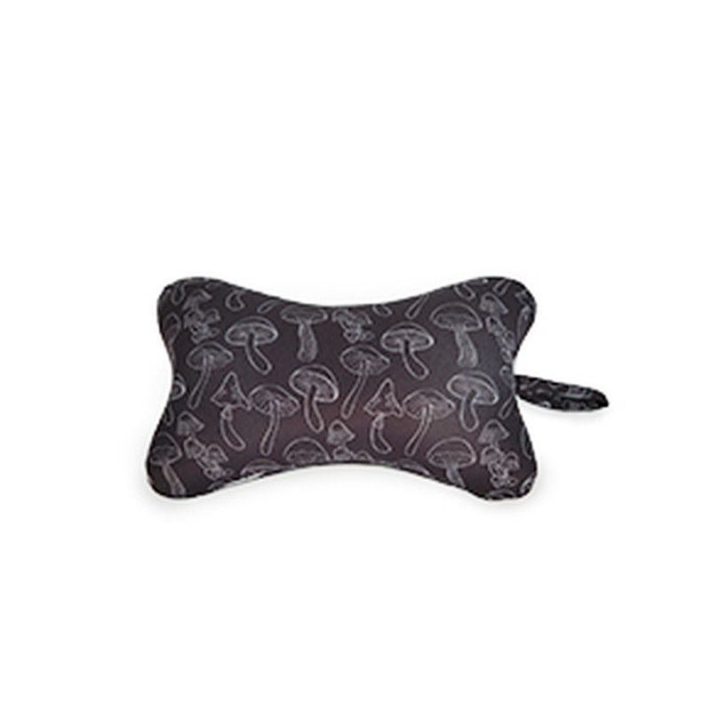Cojín Playa Setas Ferretti, ideal para regalar. Con forma de hueso y estampado de setas en tonos grises sobre fondo negro, es perfecto para decorar tu hogar o usar en la playa. Fabricado en poliéster y algodón, ofrece comodidad y estilo. Ideal para adultos que buscan un toque único en su decoración.