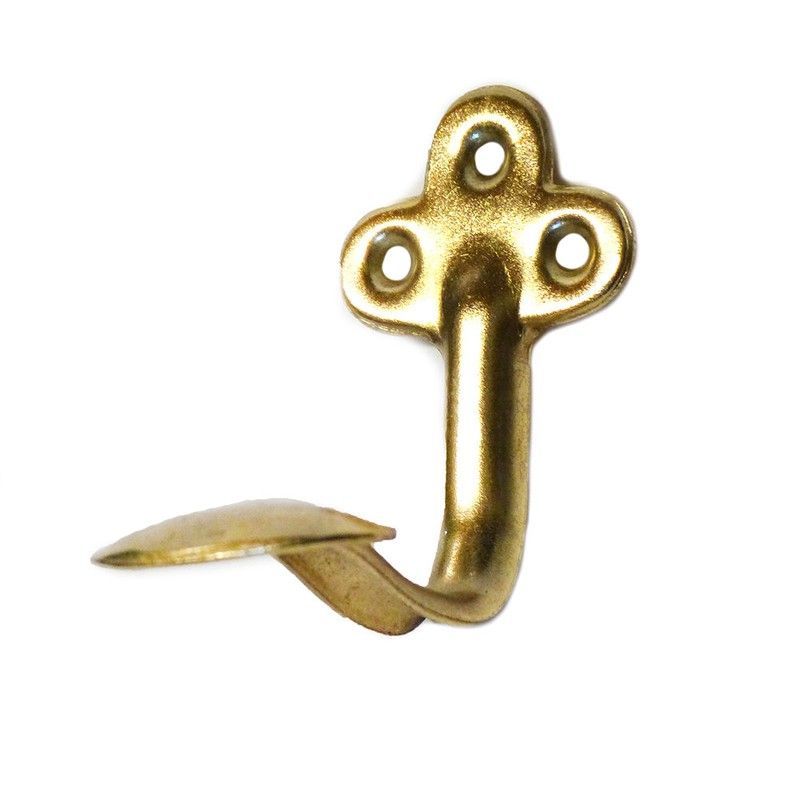 Colgador estampado en latón con acabado dorado, ideal para colgar llaves, bolsos o pequeños objetos en paredes o puertas. Fabricado en metal resistente, cuenta con tres orificios para una fijación segura y duradera. Perfecto para uso en hogar, oficina o tiendas. Diseño clásico y funcional.