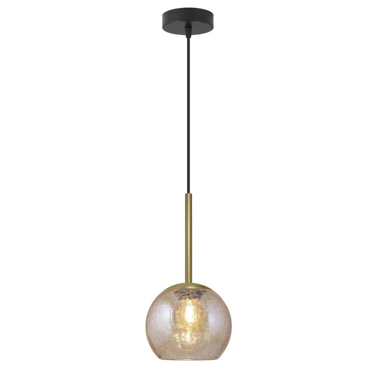 Lámpara colgante Cacela en acabado negro y dorado con difusor esférico de vidrio ámbar. Diseño moderno y elegante ideal para cocinas, comedor o salones. Fabricada en metal y vidrio de alta calidad, con un toque cálido y sofisticado. Perfecta para crear ambientes acogedores y con estilo.