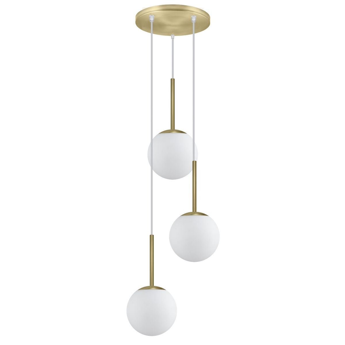 Lámpara colgante Portile con tres esferas opalinas blancas y estructura metálica dorada. Diseño moderno y elegante ideal para cocinas, comedor o salones. Fabricada en vidrio y metal de alta calidad. Iluminación cálida y ambiental perfecta para espacios contemporáneos.