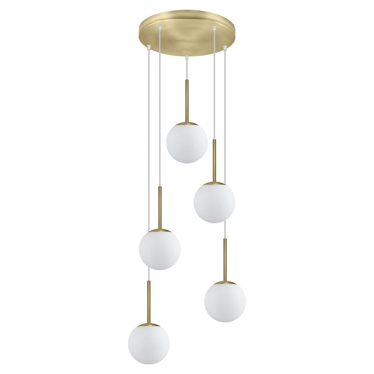 Colgante de diseño moderno con cinco luces esféricas en vidrio opalino blanco, montadas sobre estructura metálica dorada. Ideal para iluminar espacios como comedor, cocina o salón con estilo minimalista y elegante. Fácil instalación y acabado de alta calidad.