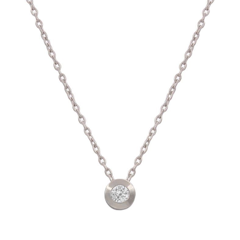 Colgante chatón para mujer en oro blanco 18k con circonita de talla brillante en el centro. Diseño elegante y minimalista, ideal para looks sofisticados. Cadena fina con eslabones delicados. Joya perfecta para regalar o lucir en ocasiones especiales.