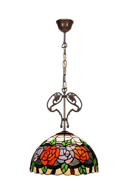 Lámpara colgante de techo con pantalla Tiffany de diseño floral, ideal para espacios con estilo clásico o vintage. Fabricada con estructura metálica y vidrio coloreado, presenta rosas en tonos rojo, naranja y gris con hojas verdes. Perfecta para cocinas, comedor o pasillos, aporta un toque elegante y cálido a tu hogar.