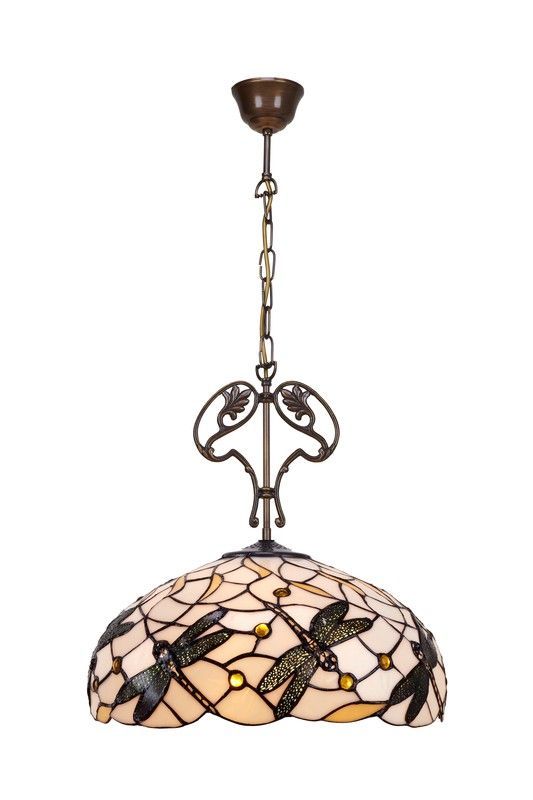 Lámpara colgante estilo Tiffany con pantalla de vidrio tallado y diseño de libélulas, ideal para espacios elegantes como comedor o salón. Fabricada con estructura metálica en acabado bronce antiguo y cadena de suspensión. Diámetro de 45 cm. Aporta un toque clásico y sofisticado a tu hogar.