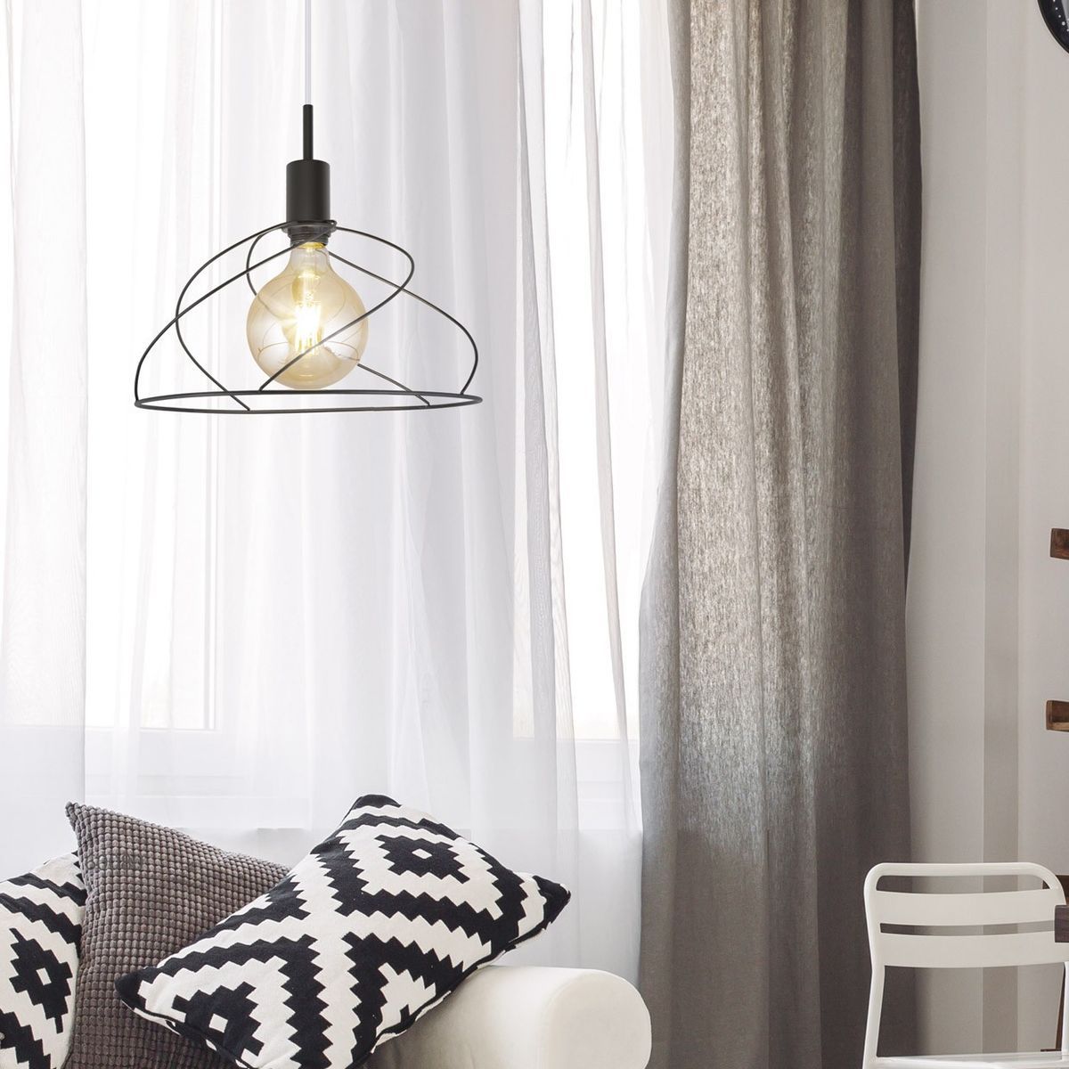 Lámpara colgante Farrel en negro, con diseño industrial y estructura metálica en forma de cesta que resalta la bombilla Edison. Ideal para espacios modernos y escandinavos, aporta estilo y luz cálida. Perfecta para salones, comedores o cocinas con toque vintage.