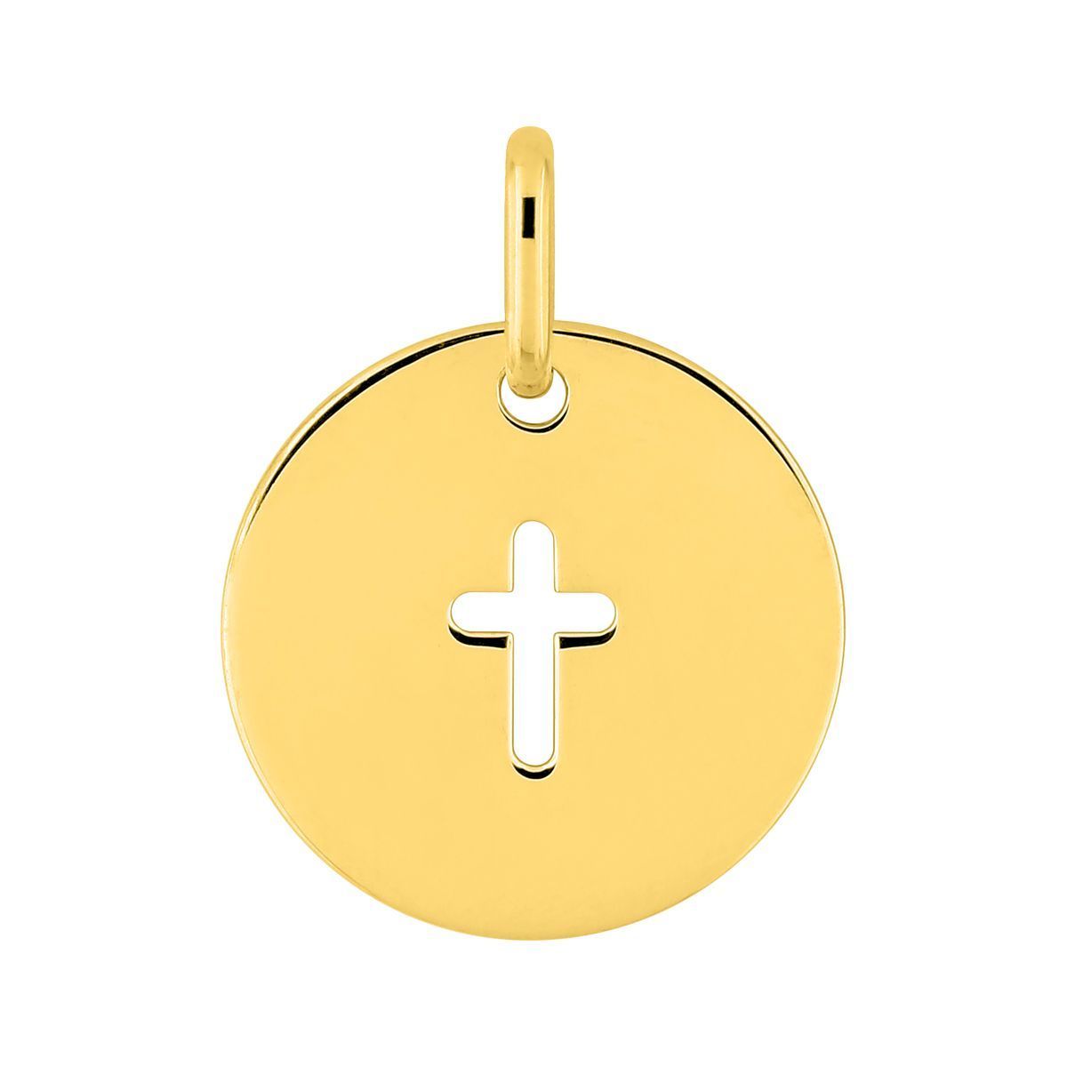 Colgante circular de metal chapado en oro con cruz calada en el centro, ideal para mujeres que buscan un accesorio elegante y con significado religioso. Diseño minimalista y acabado pulido, perfecto para combinar con cadenas finas o como pieza destacada. Ideal para uso diario o ocasiones especiales.