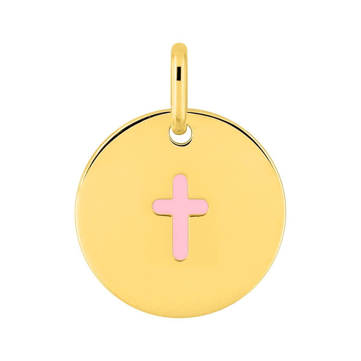 Colgante circular de metal chapado en oro con cruz de esmalte rosa, ideal para mujeres que buscan un accesorio elegante y con significado. Diseño minimalista y sofisticado, perfecto para combinar con cualquier collar o cadena. Ideal como regalo o para uso diario.