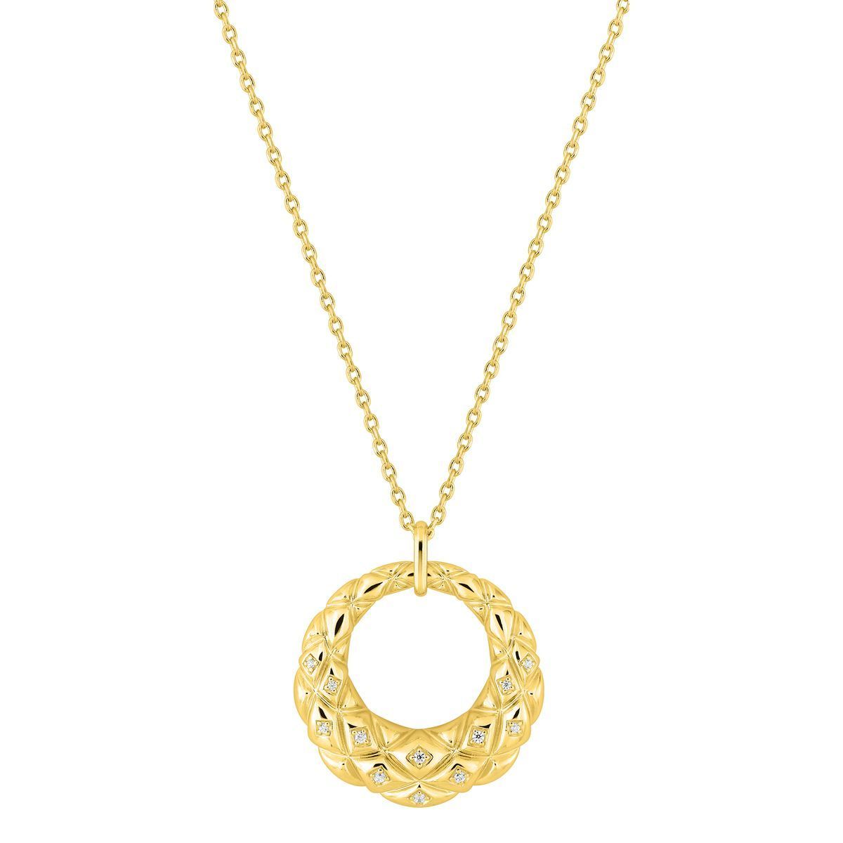 Colgante Argyor para mujer con diseño de aro trenzado en metal chapado en oro y detalles de circonitas blancas. Ideal para complementar looks elegantes o diarios. Cadena fina y ajustable. Joya sofisticada y versátil para cualquier ocasión.