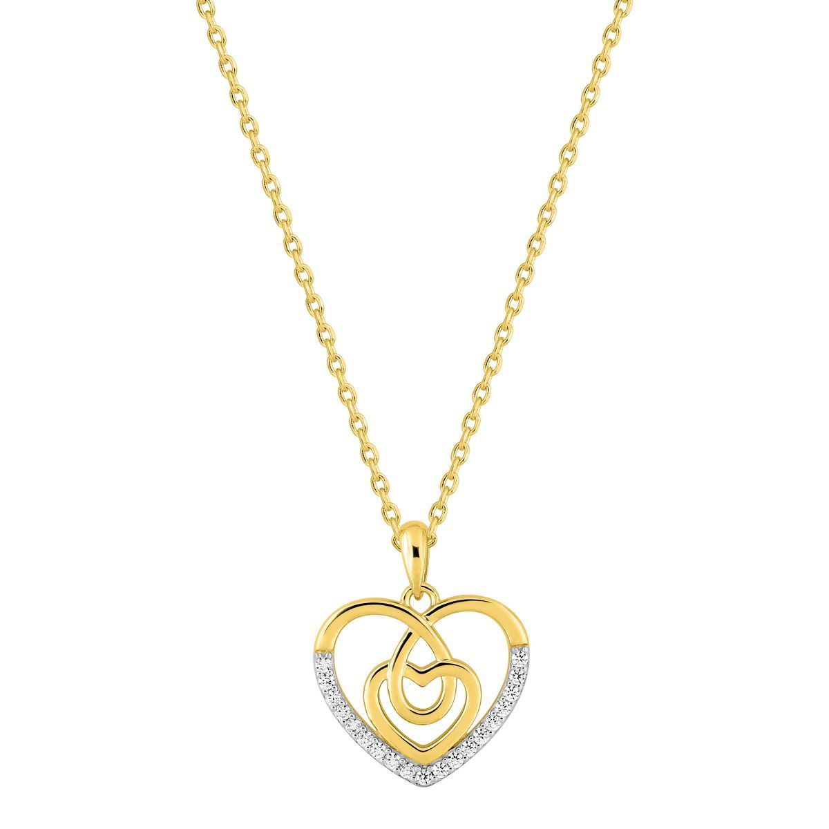 Colgante Argyor para mujer en forma de corazón con diseño de dos corazones entrelazados, chapado en oro y detalles con circonitas en el borde. Ideal para regalar o lucir en ocasiones especiales. Cadena fina y elegante, perfecta para complementar cualquier look. Joyería de calidad con acabado brillante y diseño romántico.