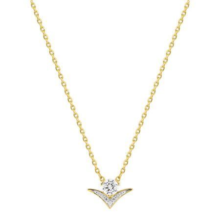 Colgante Argyor para mujer con acabado en metal chapado en oro y circonitas brillantes. Diseño en forma de V invertido con piedra central y detalles laterales, ideal para looks elegantes y diarios. Cadena fina y ajustable. Joya sofisticada para regalar o lucir con cualquier atuendo.