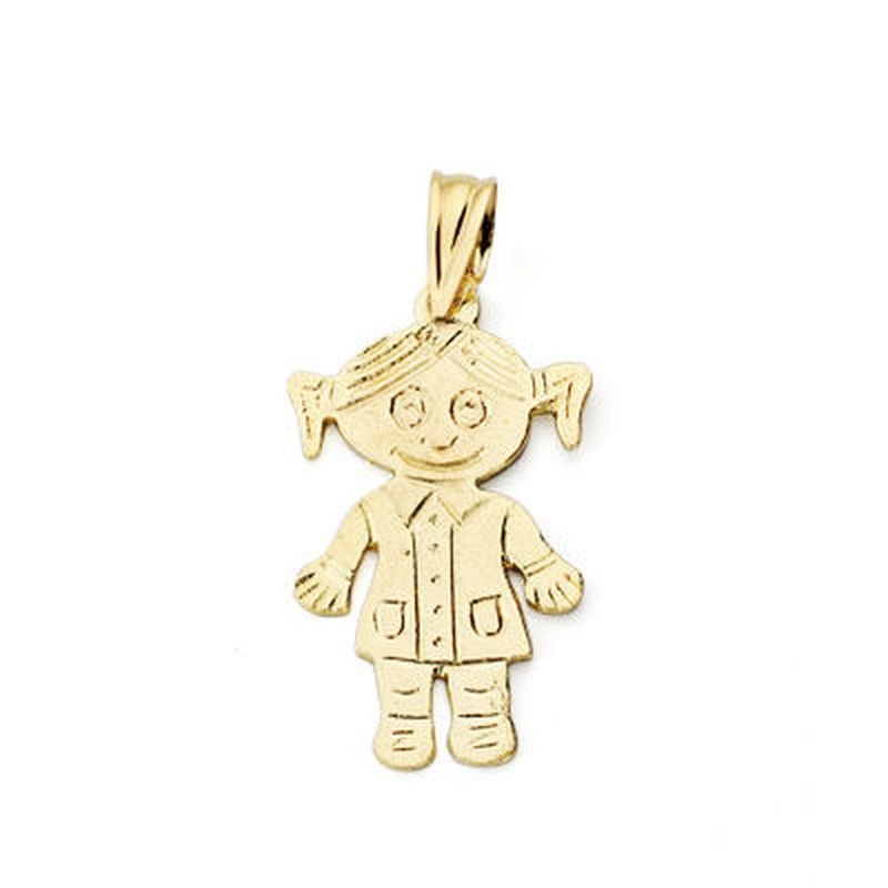 Colgante Niña en oro de 18 quilates, ideal para niños y niñas. Diseño adorable con trenzas, vestido con botones y bolsillos. Hecho en oro de alta calidad, perfecto como regalo o joya personalizada para celebrar a un ser querido. Ideal para collares infantiles o como detalle especial.