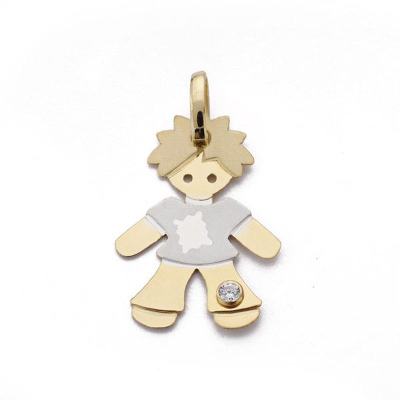 Colgante Niño en oro 18kts bicolor, ideal para niños. Diseño divertido con cuerpo plateado y detalles dorados, incluyendo un diamante en una pierna. Hecho con materiales de alta calidad, perfecto como regalo o joya personalizada para niños. Luce elegante y único en cualquier collar o pulsera.