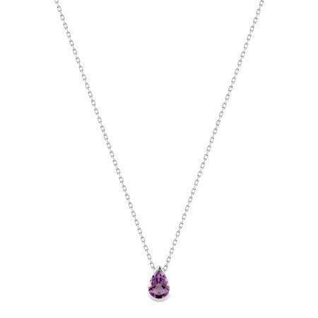 Colgante de oro blanco 9Kts con amatista en forma de gota, ideal para mujeres que buscan joyería fina y elegante. Diseño minimalista con piedra preciosa de color morado intenso, perfecto para ocasiones especiales o como complemento diario. Cadena fina y delicada, fabricado con materiales de alta calidad para un brillo duradero.