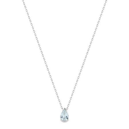 Colgante de oro blanco 9kts con piedra de aguamarina en forma de gota, ideal para mujeres que buscan joyería fina y elegante. Diseño minimalista con cadena fina y acabado pulido. Perfecto como regalo o para complementar cualquier atuendo formal o casual. Calidad premium y acabado brillante que resalta la belleza natural de la aguamarina.