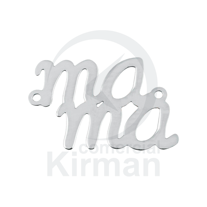 Colgante de acero inoxidable con la palabra 'MAMÁ' en letras cursivas, ideal para joyería personalizada. Diseño elegante y minimalista con acabado pulido, perfecto para crear collares, pulseras o llaveros con significado. Ideal para regalar a mamás en ocasiones especiales. Medidas aproximadas: 14x20mm.