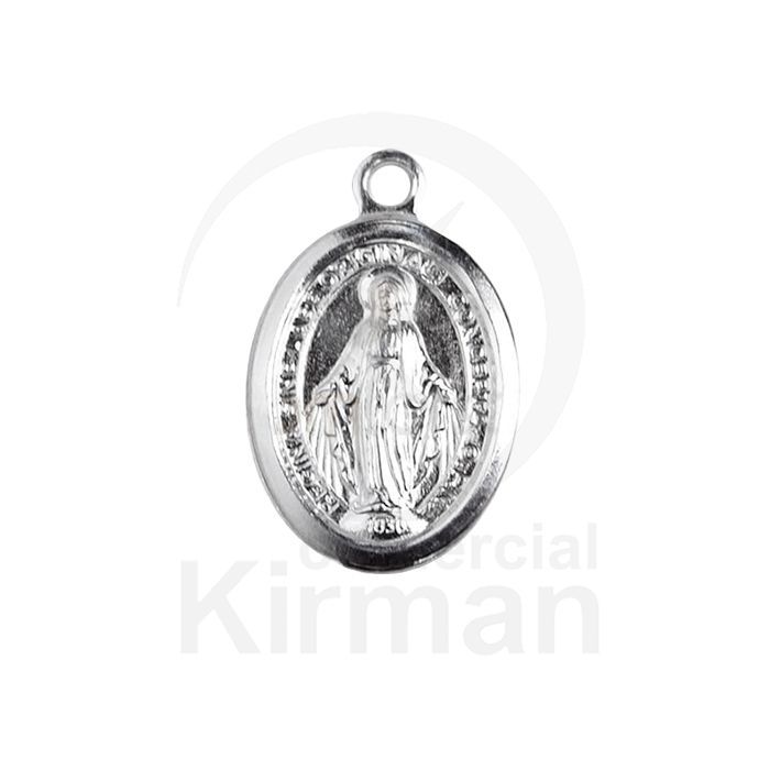 Colgante de plata con imagen de la Virgen Milagrosa, ideal para amantes de la religión y la joyería fina. Fabricado en metal con acabado plateado, presenta un diseño ovalado con relieve detallado y borde decorativo. Perfecto para usar en cadenas o collares, como símbolo de fe y protección. Medidas: 9x14 mm.