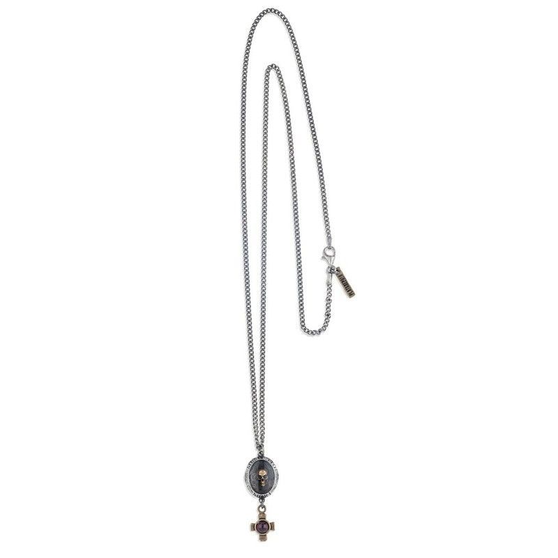 Colgante PLATA DE PALO Skull SN012X en acero inoxidable con diseño de calavera y cruz, ideal para adultos que buscan un estilo oscuro y sofisticado. Cadena fina y ajustable, perfecta para usar como collar largo o como complemento versátil. Calidad duradera y acabado plateado que resalta el detalle negro de la calavera.