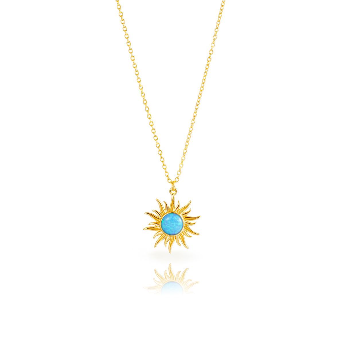 Colgante sol en metal dorado con piedra mineral sintética azul ópalo, ideal para mujeres que buscan un toque de elegancia y energía solar. Diseño delicado con rayos estilizados y cadena fina, perfecto para usar diariamente o como regalo especial. Calidad duradera y acabado brillante.