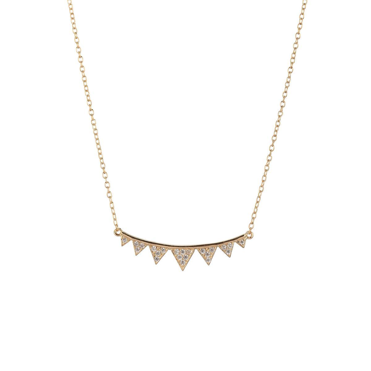 Colgante dorado con diseño de triángulos incrustados con circonitas, ideal para mujeres que buscan un toque de elegancia y sofisticación. Fabricado en metal de alta calidad, con cadena fina y ajustable. Perfecto para usar diariamente o como complemento en ocasiones especiales. Un accesorio versátil que combina con cualquier look.