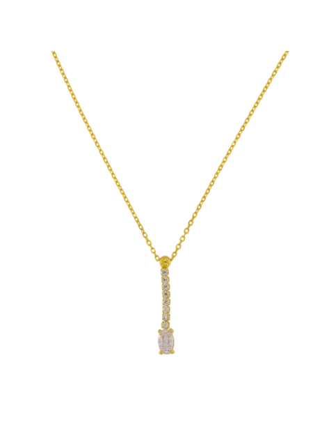 Colgante para mujer en metal dorado con circonitas, diseño vertical y elegante. Ideal para looks sofisticados y diarios. Cadena fina con barra de circonitas y piedra cuadrada en la base. Joya perfecta para regalar o lucir en cualquier ocasión.