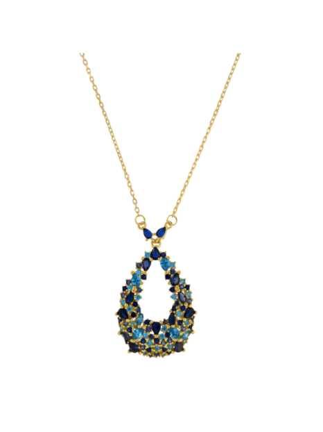 Elegante colgante para mujer en forma de gota, con acabado en metal dorado y circonitas multicolor en tonos azules y negros. Ideal para complementar looks formales o semi-formales. Diseño sofisticado y brillante, perfecto para ocasiones especiales o como regalo exclusivo.