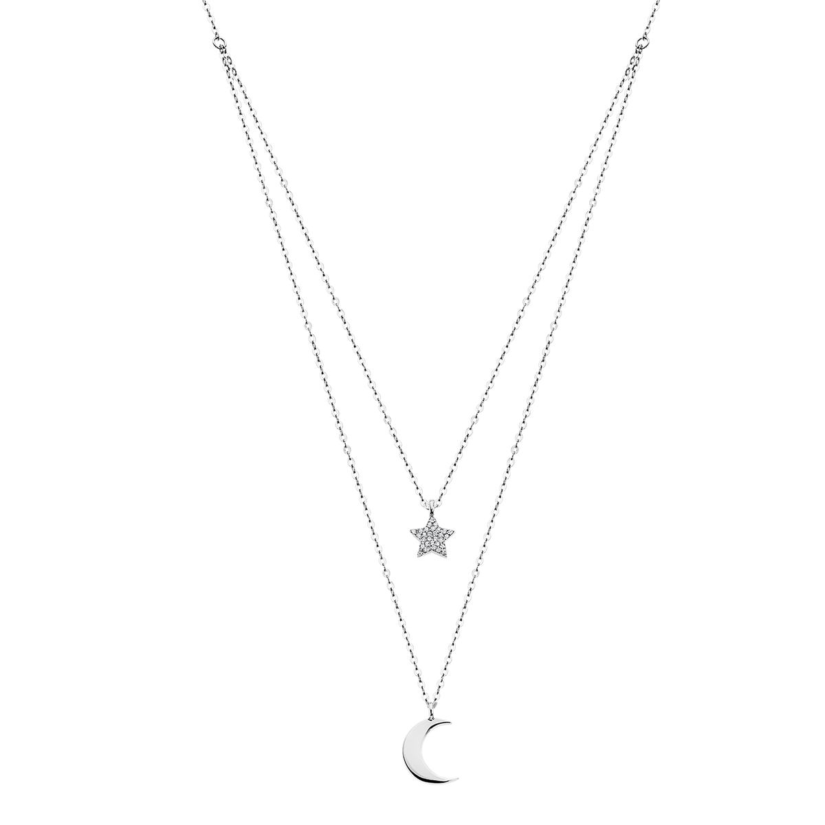Colgante de plata con diseño de media luna y estrella incrustada con circonitas, ideal para mujeres que buscan un toque de elegancia y sofisticación. Cadena fina y ajustable, perfecta para usar sola o combinada con otros collares. Material de alta calidad, resistente y con acabado brillante. Ideal como regalo o para complementar tu look diario.
