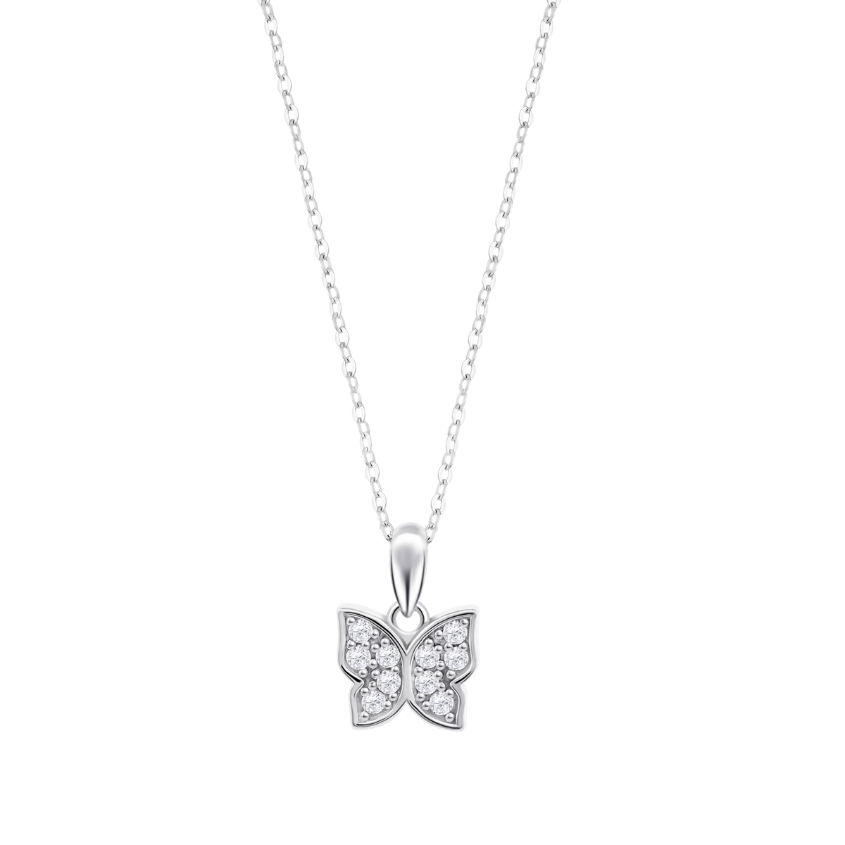 Colgante de plata con diseño de mariposa y circonitas brillantes, ideal para mujeres que buscan un toque de elegancia y sofisticación. Perfecto como regalo o para complementar cualquier atuendo. Cadena fina y acabado pulido para un look eterno y versátil.