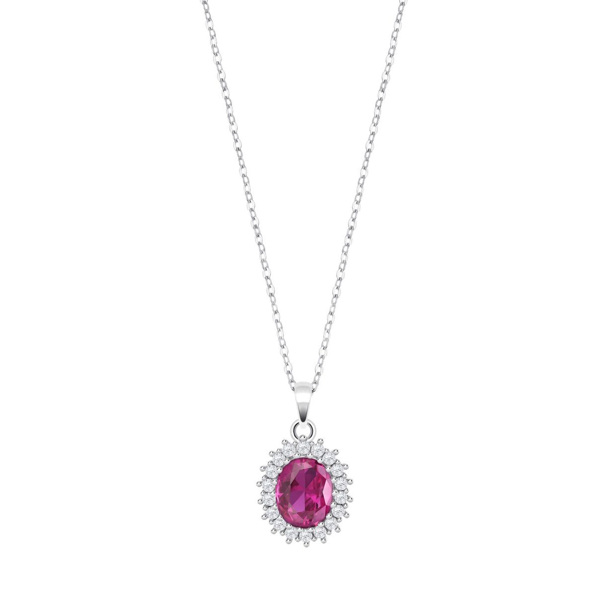 Colgante Lotus LP3459-1/4 en plata con circonitas fucsia y blancas, diseño ovalado y elegante. Ideal para mujeres que buscan un toque de sofisticación en su joyería diaria o para ocasiones especiales. Cadena fina y acabado brillante que resalta la belleza de las piedras. Un accesorio versátil y atemporal.