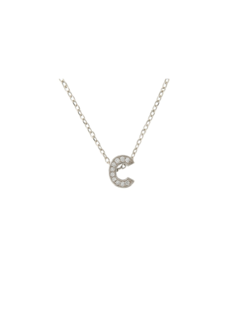 Colgante de plata con forma de letra C, adornado con circonitas brillantes. Ideal para mujeres que buscan un toque de elegancia y personalidad. Cadena fina y diseño minimalista, perfecto para usar diariamente o como regalo especial. Combina con cualquier atuendo para un look sofisticado y moderno.