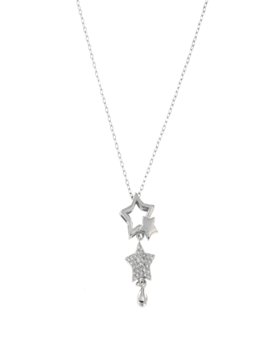 Elegante colgante de plata para mujer con diseño de estrellas, ideal para looks sofisticados. La estrella superior es hueca y la inferior está adornada con circonitas brillantes, finalizando en una delicada gota metálica. Perfecto para regalar o lucir en ocasiones especiales. Hecho con materiales de calidad para un brillo duradero.