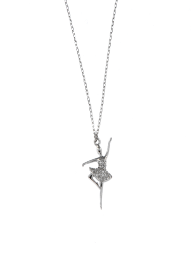 Colgante de plata para mujer con diseño de bailarina en pose de ballet, adornado con circonitas que brillan con elegancia. Ideal para amantes de la danza y la joyería fina. Cadena fina y diseño delicado, perfecto para usar diariamente o como regalo especial. Calidad duradera y acabado pulido.