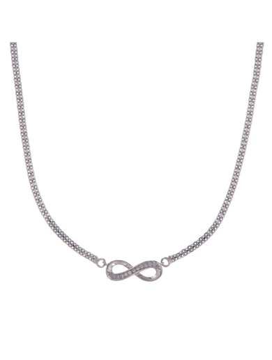 Colgante de plata para mujer con diseño de infinito y circonitas incrustadas, ideal para looks elegantes y diarios. Cadena fina con eslabones pequeños y acabado plateado brillante. Joya versátil para regalar o lucir en cualquier ocasión.