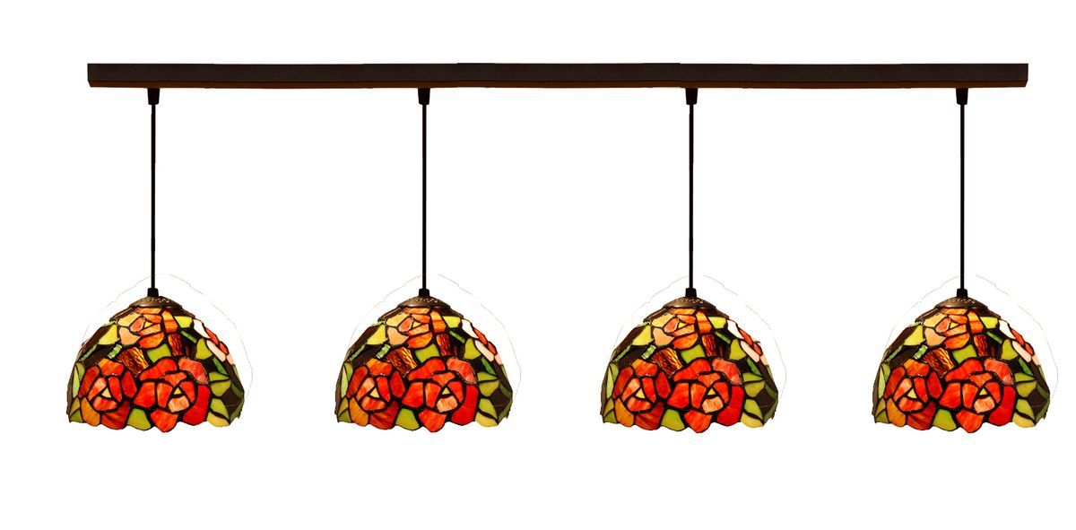Lámpara colgante Tiffany con 4 pantallas de vidrio tallado en diseño floral, ideal para cocinas, comedor o espacios con estilo clásico. Fabricada con vidrio de colores y estructura metálica, aporta un toque elegante y cálido a tu hogar. Perfecta para crear una iluminación ambiental sofisticada.