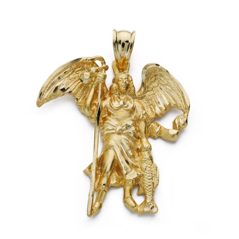 Colgante San Rafael en oro 18kts con diseño tridimensional de ángel alado, acabado brillante y detalles tallados. Ideal para quienes buscan una pieza religiosa de alta calidad y elegancia. Perfecto como regalo o para uso personal diario. Medidas: 33x29mm.