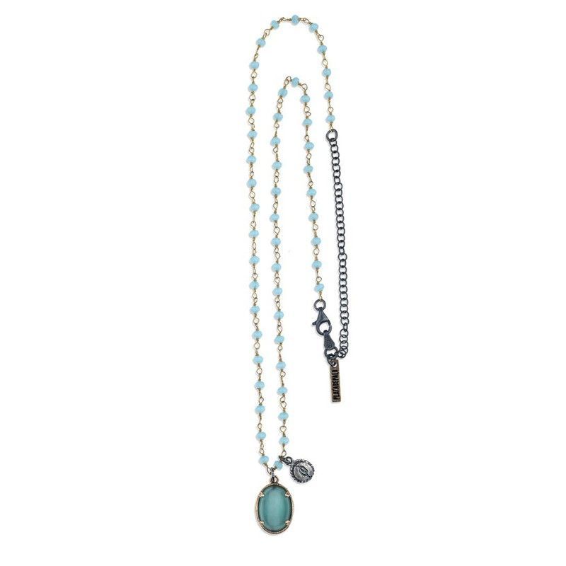 Collar PLATA DE PALO WN115X con elegante diseño de cuentas de calcedonia azul claro y cadena metálica. Ideal para mujeres que buscan un toque sofisticado y natural. El pendiente ovalado de calcedonia resalta con un bisel plateado, mientras que el cierre con extensor permite ajustar la longitud. Perfecto para combinar con looks casuales o formales.