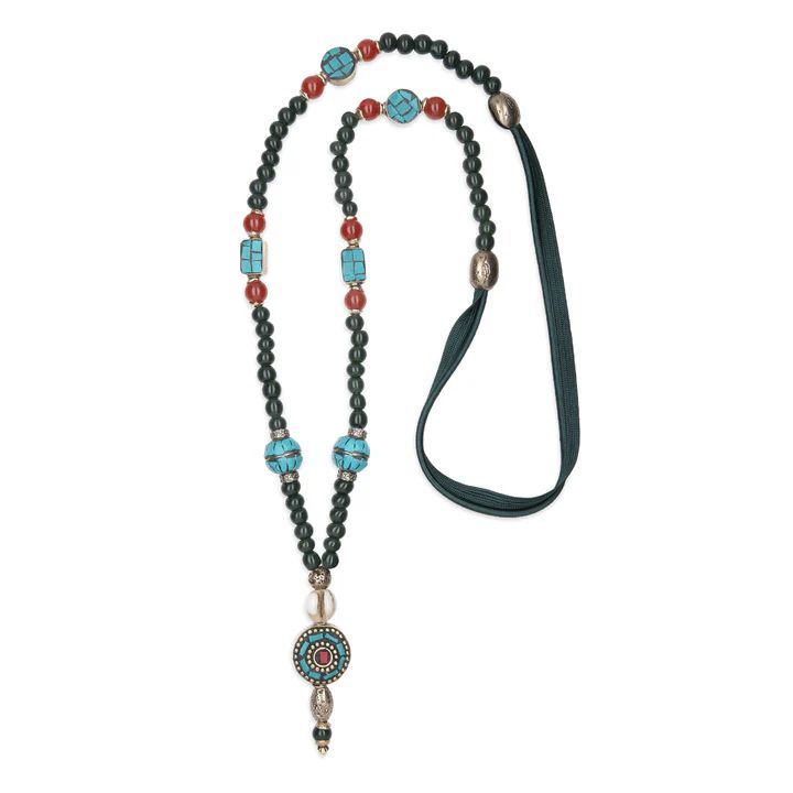 Collar PLATA DE PALO de mujer de la colección Lavinia, con diseño rústico y atemporal. Combina cuentas negras, turquesas y detalles rojos con un colgante circular decorado con piedras. Ideal para looks bohemios o elegantes. Hecho con materiales de calidad, incluye cierre con cuerda verde oscuro. Perfecto para mujeres que buscan joyería única y con