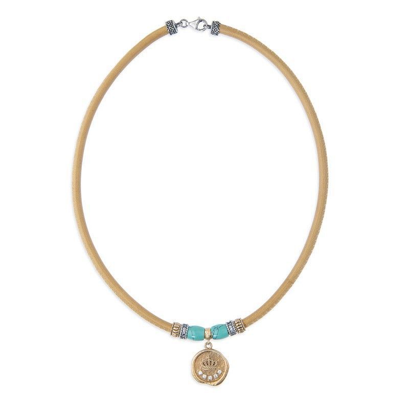Collar de mujer en cuero cosido color camel con acabados en metal plateado y dorado. Destaca por su colgante circular con diseño de sol y detalles en relieve, acompañado de cuentas turquesa y aros decorativos. Ideal para looks elegantes y sofisticados, combina estilo y artesanía de calidad. Perfecto para mujeres que buscan joyería única y con perso