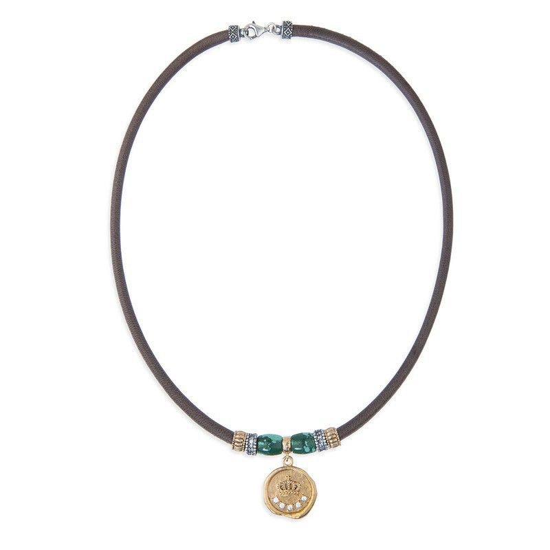 Collar de mujer en cuero cosido color visón, con acabados en bronce, plata y circonitas blancas. Destaca por su colgante circular con diseño de corona y detalles brillantes. Ideal para looks elegantes o diarios, combina estilo y sofisticación. Perfecto para mujeres que buscan joyería con personalidad y calidad.