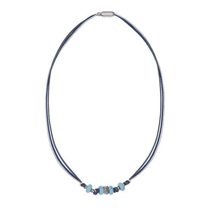Collar PLATA DE PALO para mujer en nylon, colección Ambar. Diseño elegante y atractivo con cuentas en tonos azules y plateados. Ideal para looks casuales o sofisticados. Cierre metálico seguro y cómodo. Perfecto para complementar tu estilo diario con un toque de sofisticación.