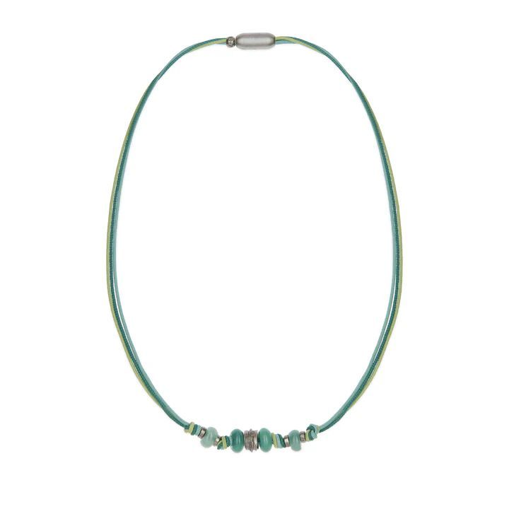 Collar Aurora para mujer en nylon verde con cuentas de resina en tonos verdes y plateados. Cierre magnético discreto y diseño minimalista ideal para looks casuales o elegantes. Perfecto para combinar con cualquier atuendo diario o ocasional.