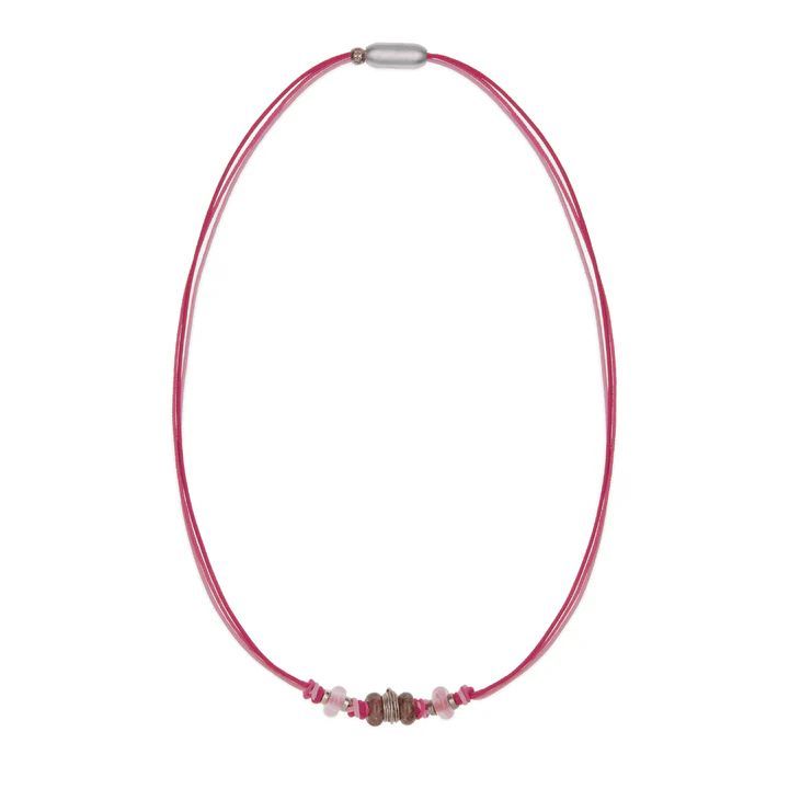 Collar PLATA DE PALO para mujer en nylon rosa con detalles de resina en tonos rosados y marrones. Cierre magnético plateado para un ajuste cómodo y seguro. Diseño minimalista y elegante, ideal para complementar looks casuales o sofisticados. Perfecto para diario o ocasiones especiales.