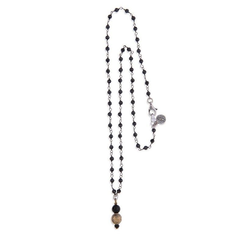 Collar largo para mujer en acero inoxidable con cuentas de cuarzo negro, ideal para looks elegantes o diarios. Cierre de mosquetón con medalla y pendiente final con detalles en negro, dorado y plateado. Diseño sofisticado y versátil para combinar con cualquier atuendo.