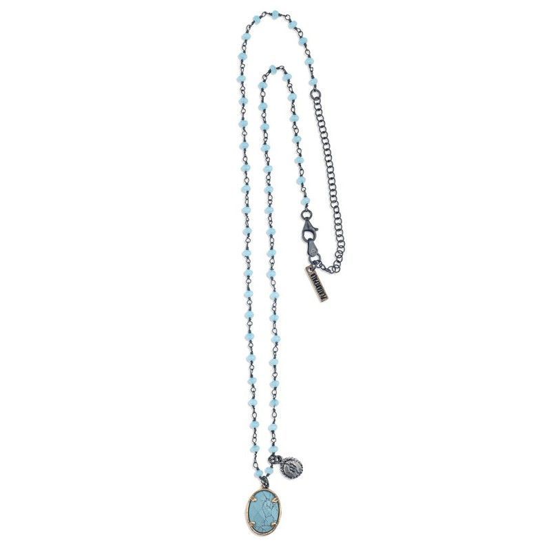 Collar PLATA DE PALO Rosario WN113X, elegante y sofisticado, ideal para mujeres que buscan un toque de estilo con detalles únicos. Fabricado con cadena metálica plateada y cuentas azules claras, destaca por su pendiente ovalado con piedra turquesa y colgante decorativo. Perfecto para combinar con looks casuales o formales, añade un aire bohemio y r